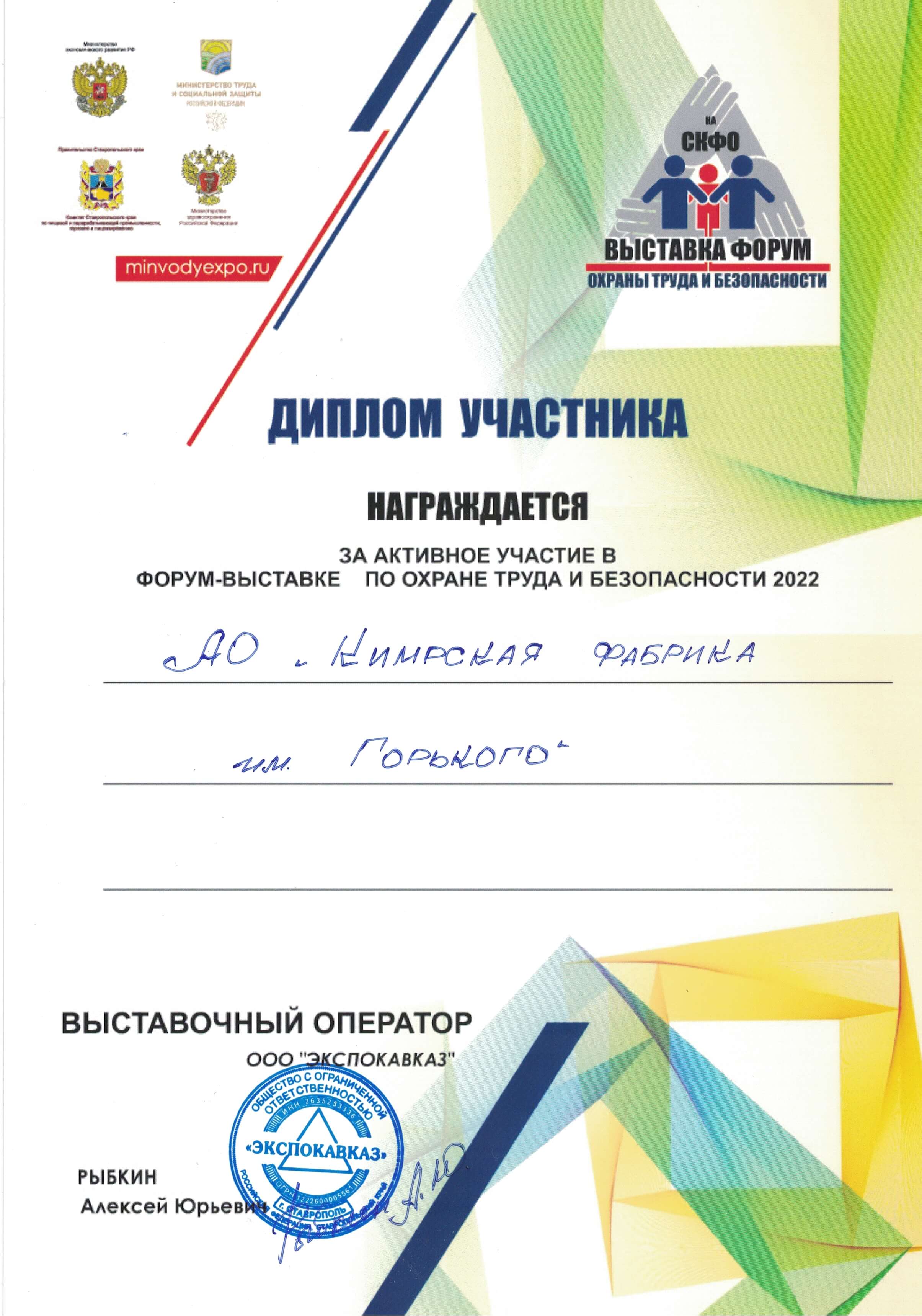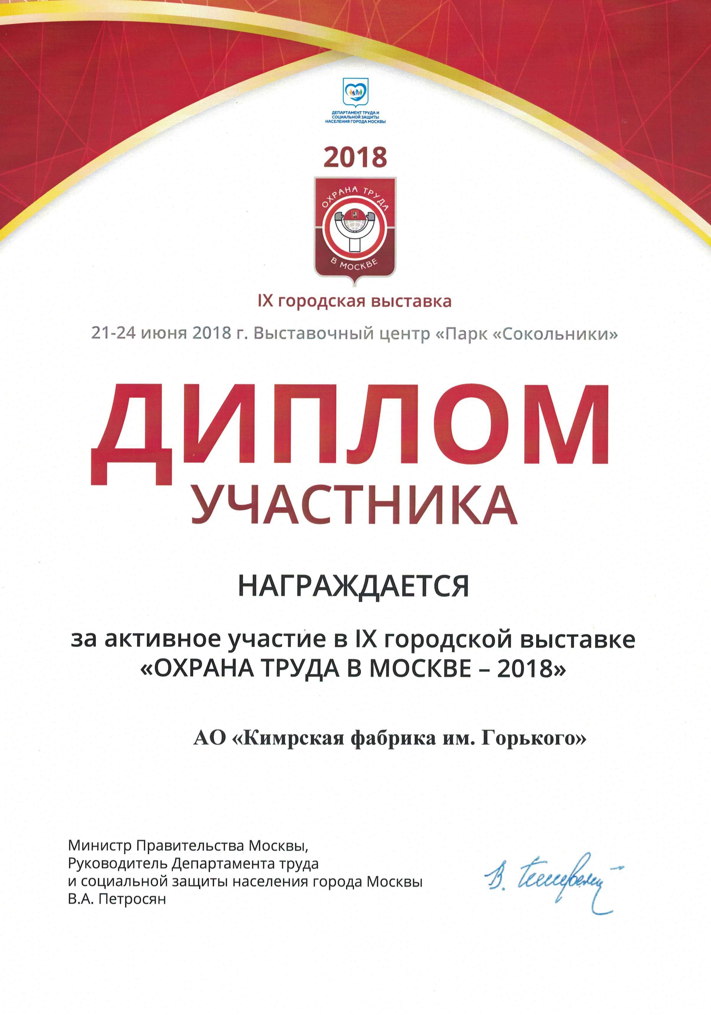 Диплом участника форум-выставки по охране труда и безопасности