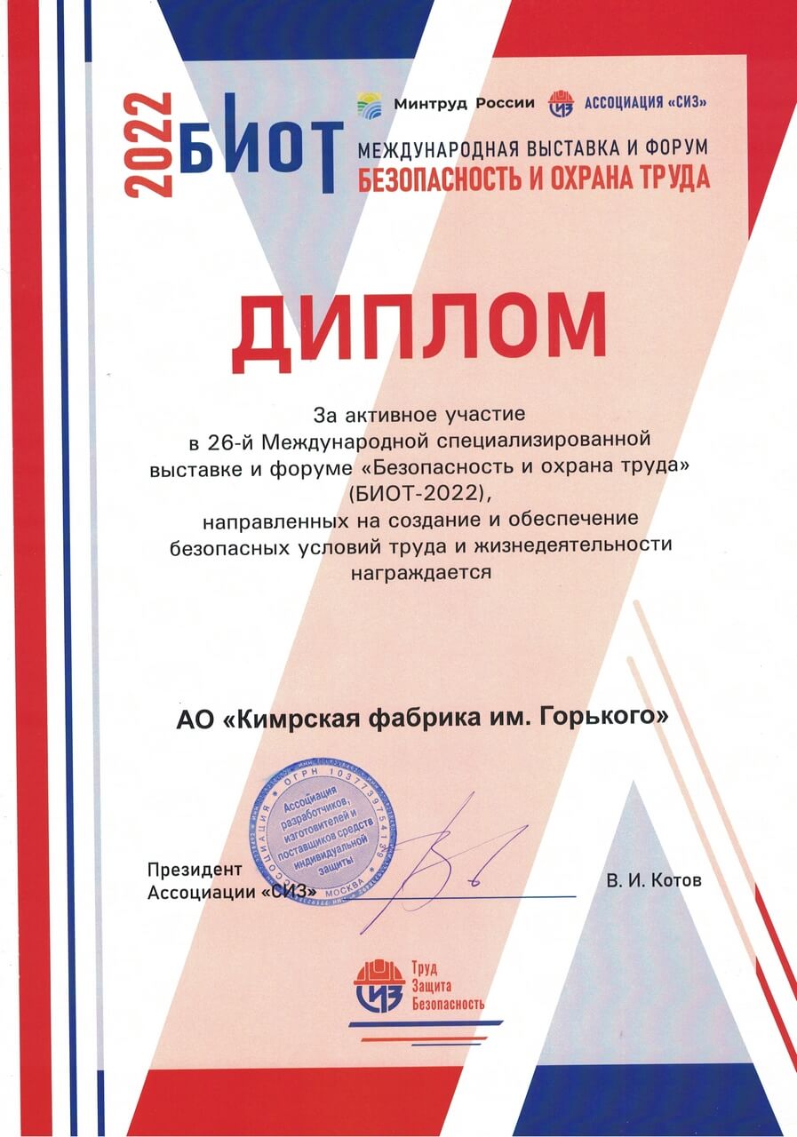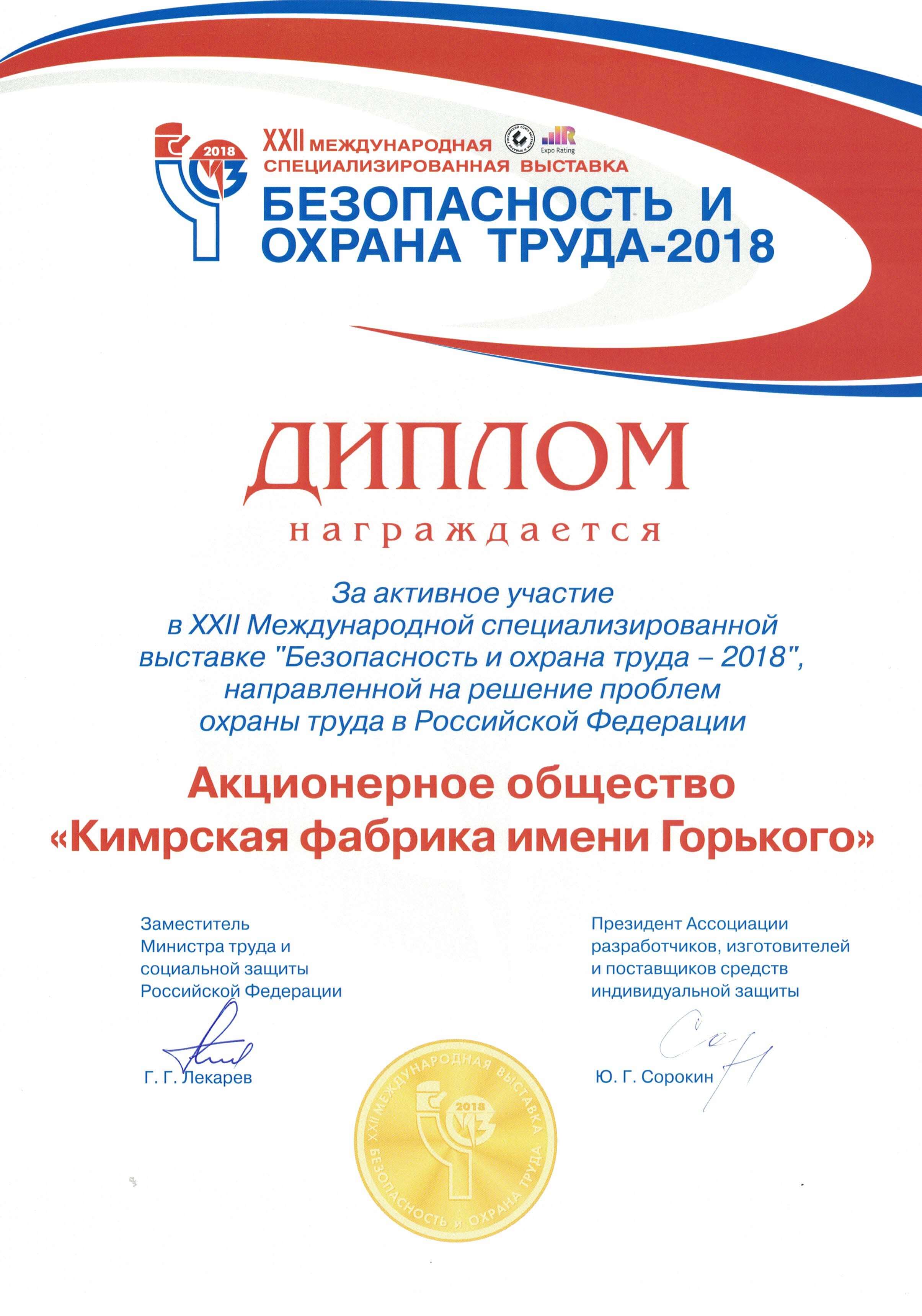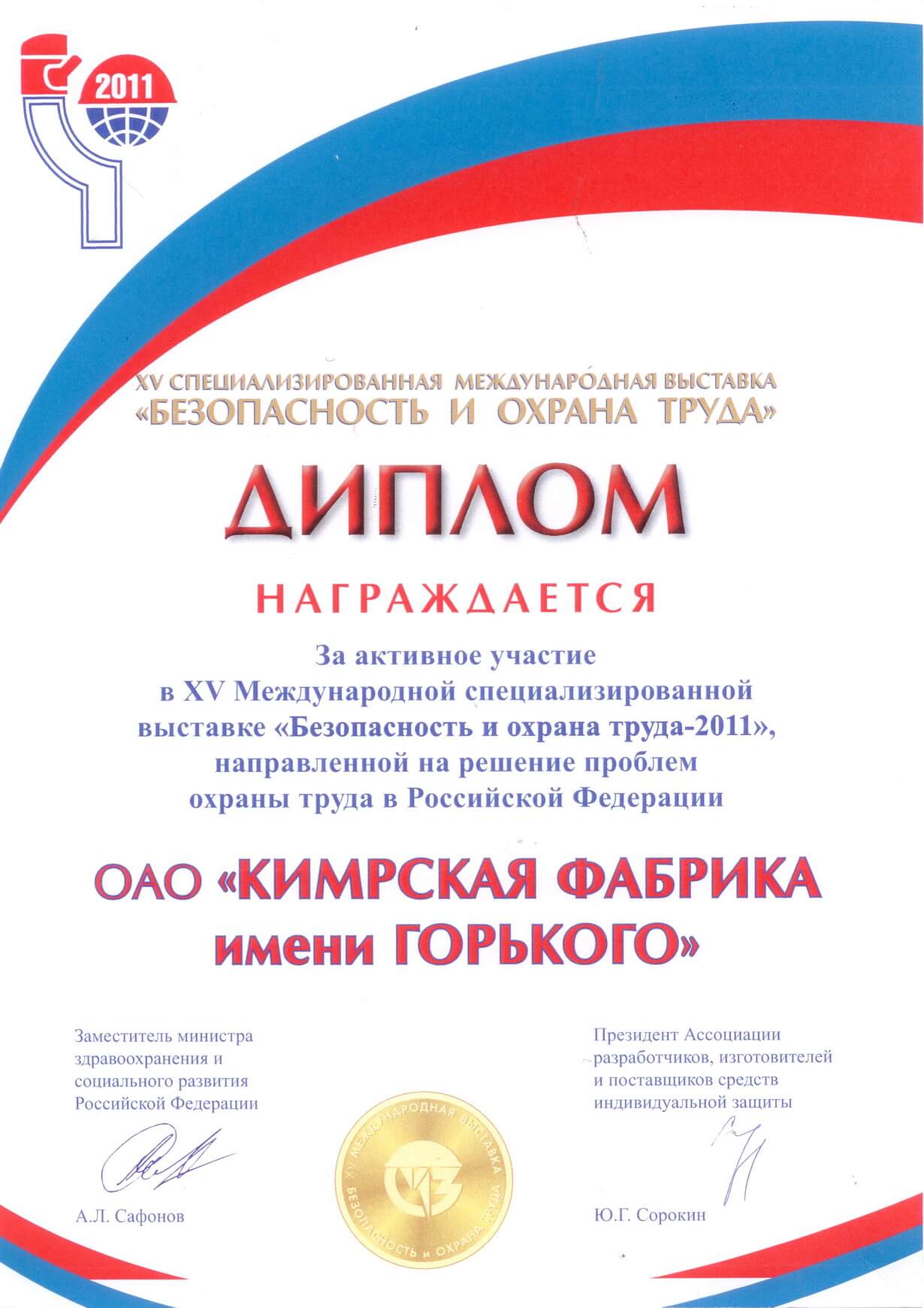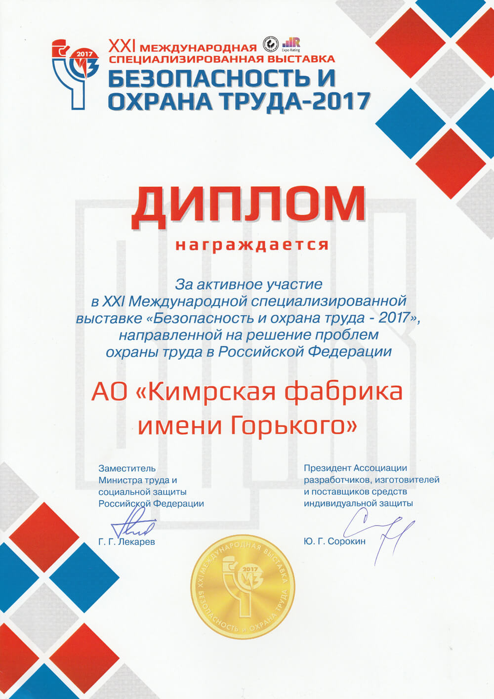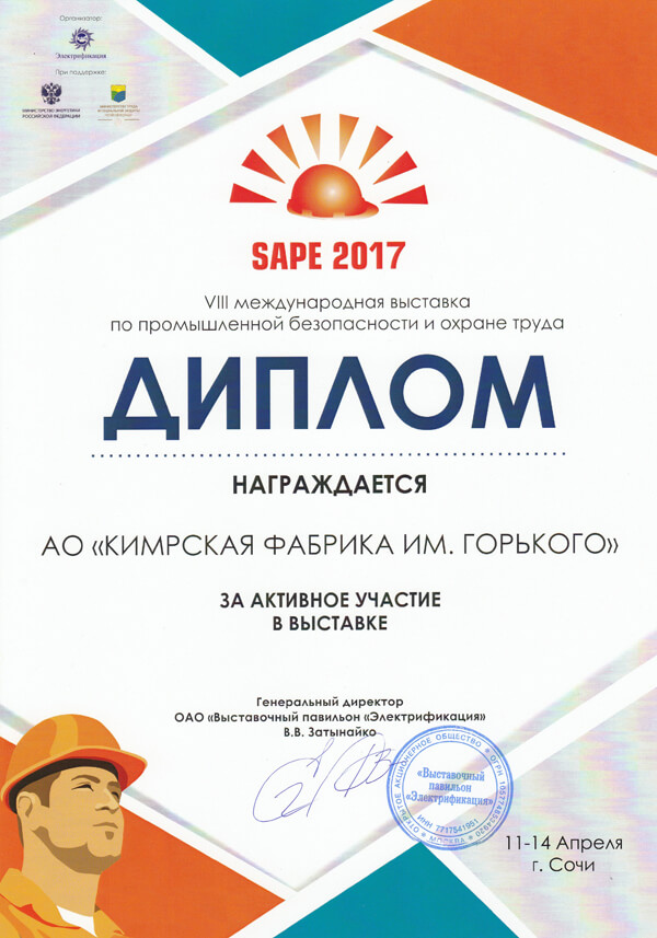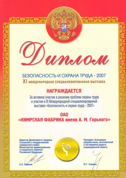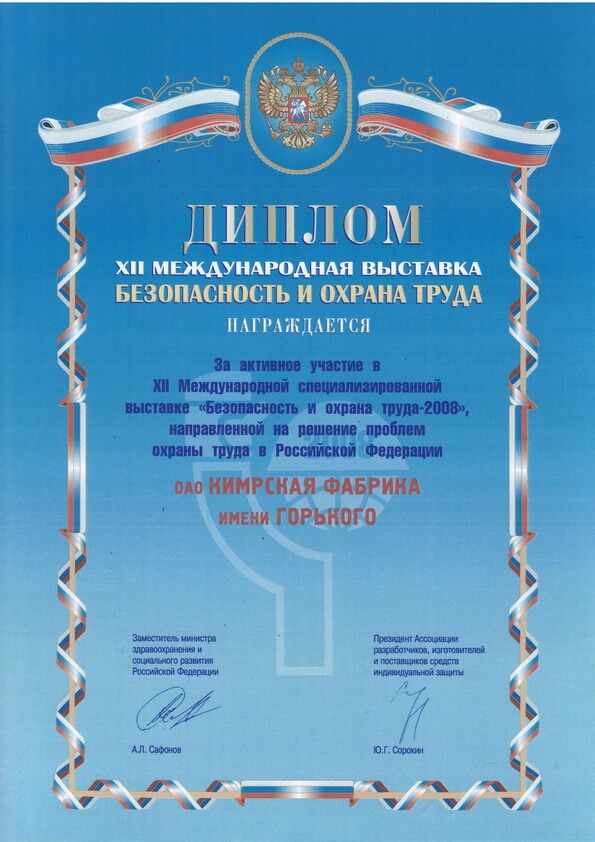 Диплом за участие в выставке «Безопасность и охрана труда»