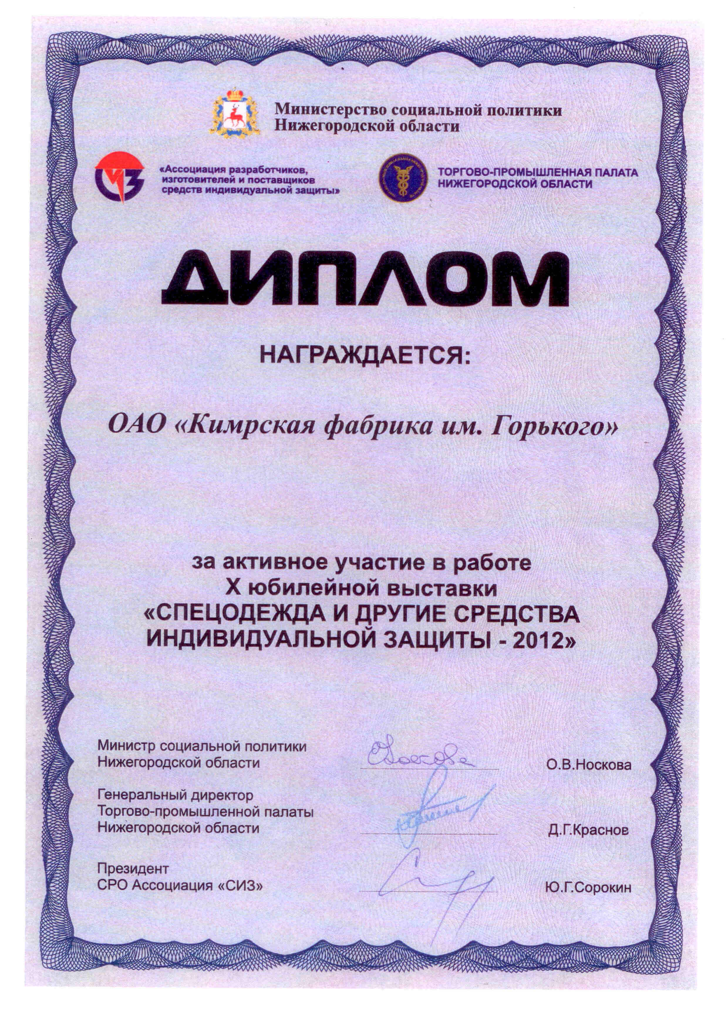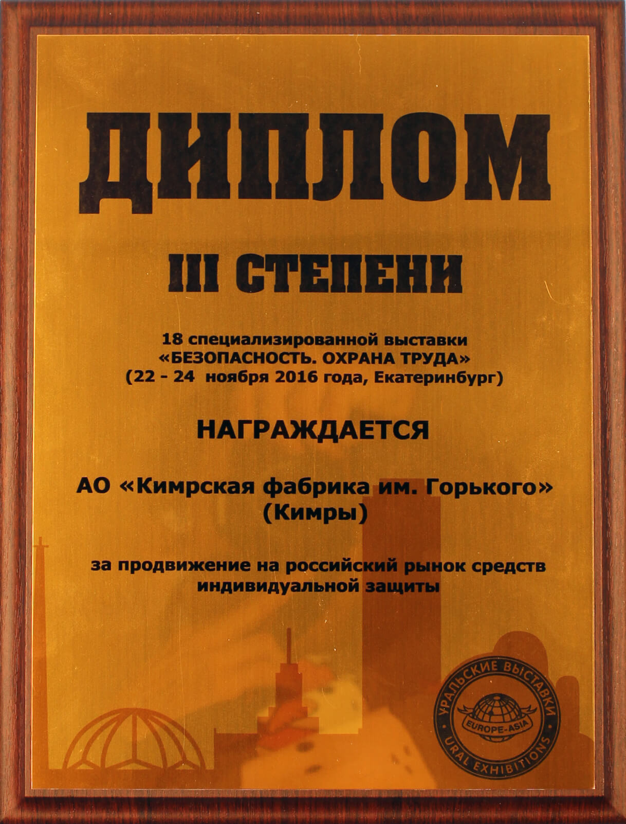 Диплом за продвижение на рынок средств индивидуальной защиты