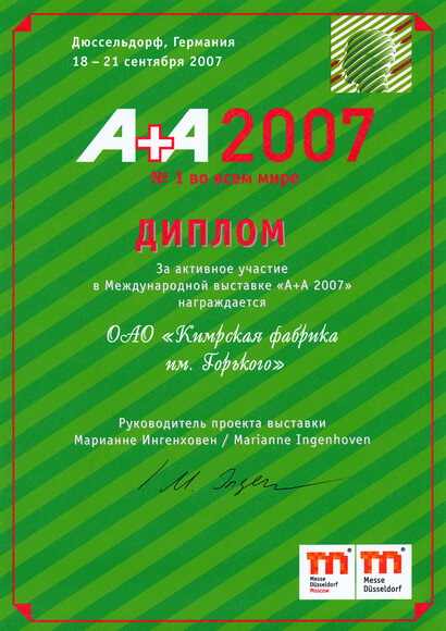 Диплом за участие в Международной выставке "А+А 2007"