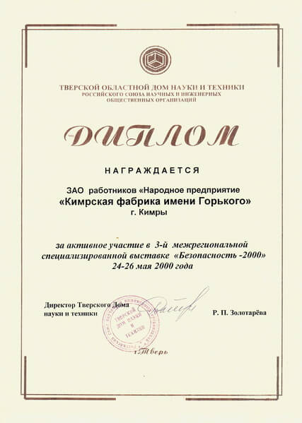 Диплом межрегиональной выставки "Безопасность – 2000"